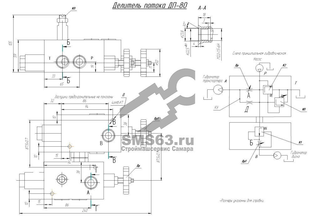 ДП80 (делитель потока) разработан для коммунальной машины для управления приводом посыпки дорожного полотна. ДП-80 позволяет уменьшить применение гидронасосов в схеме управления приводами транспортера и пескоразбрасывателя до одного. Привод пескоразбрасывателя присоединяется к каналу В, привод транспортера к каналу А. При наличии на машине других гидравлических приводов магистраль подачи «Р» ДП80 можно соединять с полостным отводом с одной из секций имеющегося распределителя.