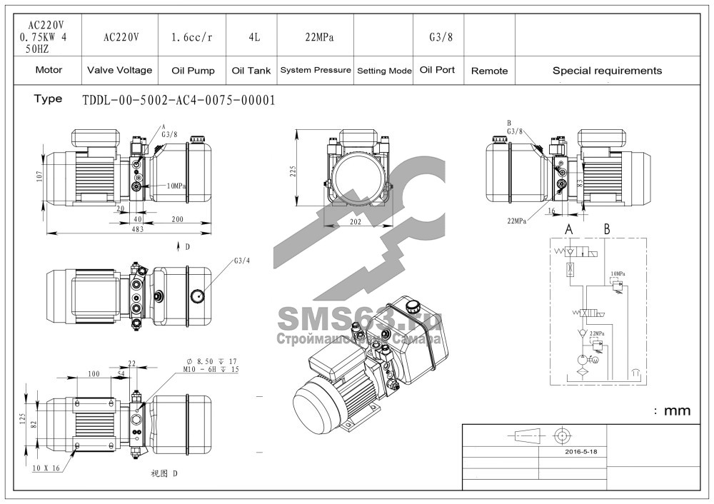 (22 MPa. AC220V 0,75 KW. 4L Tank. Valve AC220V. Port G3/8")