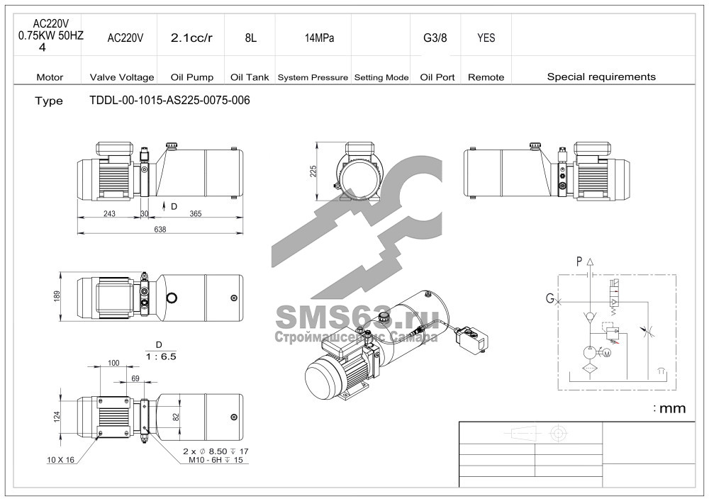 Станция насосная гидравлическая TDDL-00-1015-AS225-0075-006: 14MPa. 220V 0,75KW. 1450RPM. 2,1cc/r 8L Tank steel round horizontal. SV-08-2NCP-M-AC220V. Port G3/8" With 2 button remote cable