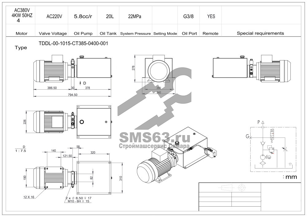 Станция насосная гидравлическая TDDL-00-1015-CT385-0400-001: 22MPa. 380V 4 KW. 1450RPM 5,8cc/r 20L Tank steel round horizontal. SV-08-2NCP-M-AC220V. Port G3/8" With 2 button remote cable